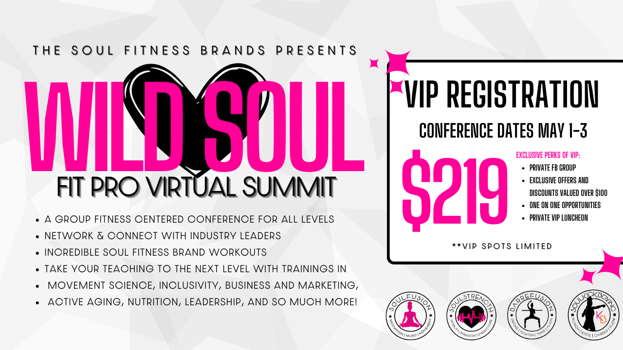 Join us for the VIP experience of our second annual WILD SOUL Fit Pro Summit- a totally Virtual Conference designed for the fitness instructor.